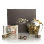 Per preparare correttamente un tè di fiori e godersi la magia del loro pieno sbocciare, servono gli strumenti giusti, come la teiera in vetro Florian, termoresistente, dotata di una base relativamente ampia e sufficientemente alta per consentire al fiore di aprirsi completamente e mostrarsi in tutta la sua altezza. La sua forma quadrata è l’ideale per dare stabilità al fiore schiuso, impedendo che si capovolga quando si versa il tè. Il nastro oro in raso legato al manico e bloccato da un anellino consente di tenere fermo il coperchio, mentre il logo serigrafato sul fronte la indentifica come un prodotto a marchio Florian.